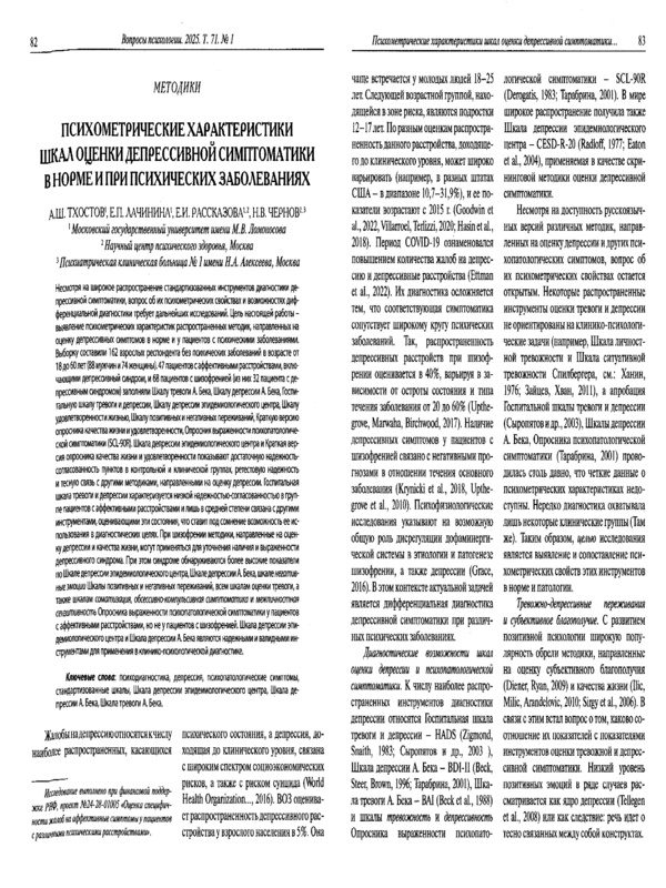 Психометрические характеристики шкал оценки депрессивной симптоматики в норме и при психических заболеваниях